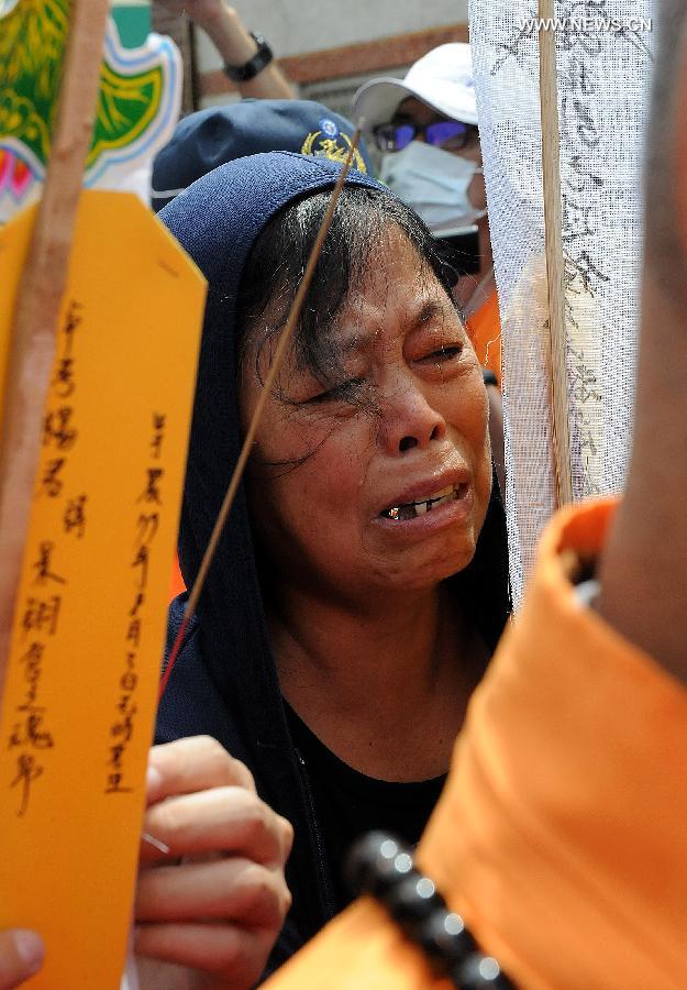 Family members of victims in a plane crash accident hold memorial service for their beloved ones at the accident site after a Taiwan plane smashed into residential buildings following a failed emergency landing in the outlying island county of Penghu, southeast China's Taiwan, July 24, 2014. Forty-eight people have been confirmed dead and 10 others injured in the plane crash, which occurred on Wednesday evening. The plane, TransAsia Airways Flight GE 222, with 58 people on board, was then on its way from Taiwan's Kaohsiung to Penghu. (Xinhua/He Junchang)