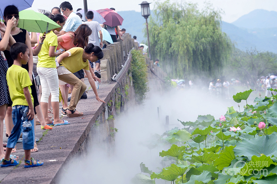 Tourists enjoy the cool spray at West Lake in Hangzhou of east China's Zhejiang province on July 19, 2014. (Photo/CNTV)