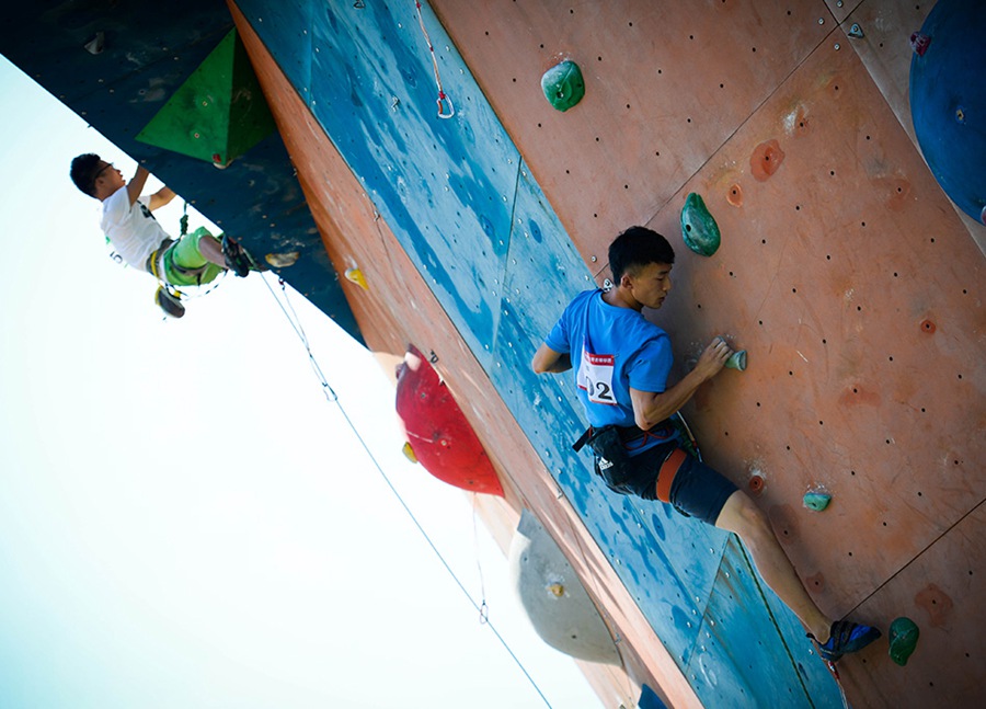 The Twelfth National College Climbing Championships start in Sichuan Institute of Tourism in Chengdu, July 24, 2014. The four-day tournament tests athletes in speed, difficulty of climbing and bouldering project. 245 athletes from 40 colleges and universities including Peking University, Donghua University, University of Macau, and 93 team leaders and coaches participated in the contest.(Xinhua/Li Qiaoqiao)