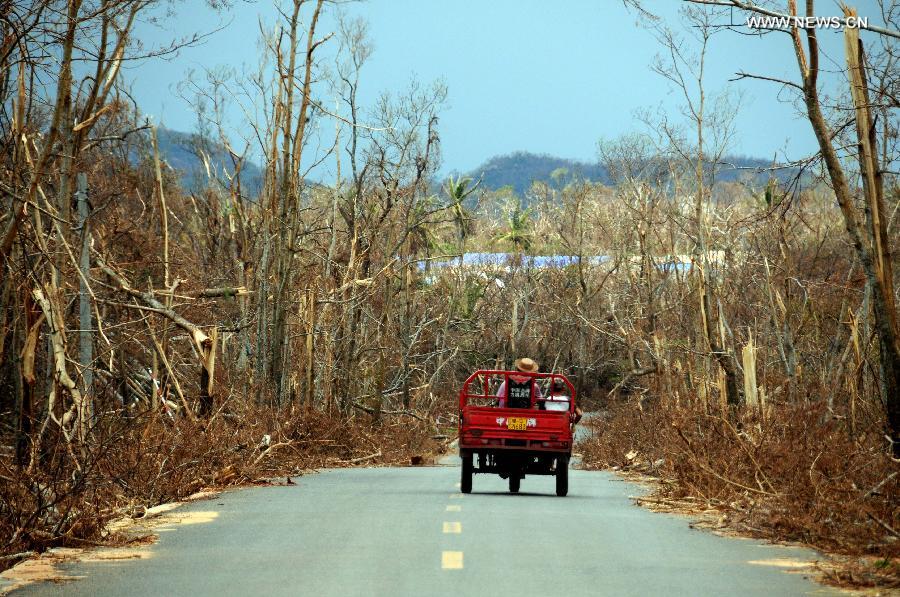 A tricycle makes its way along a road flanked by tree bulks snapped during Typhoon Rammasun's landfall in Wengtian Town of Wenchang, south China's Hainan Province, July 27, 2014. Typhoon Rammasun, which made its landfall in Wenchang on July 18, was the strongest typhoon that hit south China in four decades. According to China's Ministry of Civil Affairs, the super typhoon has killed 62 people as of Friday, with another 21 still missing. (Xinhua/Wei Hua)