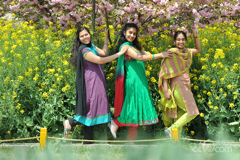 Three Indian students pose for photos in a park in Nanjing on April 11, 2013.(Photo/CNTV)