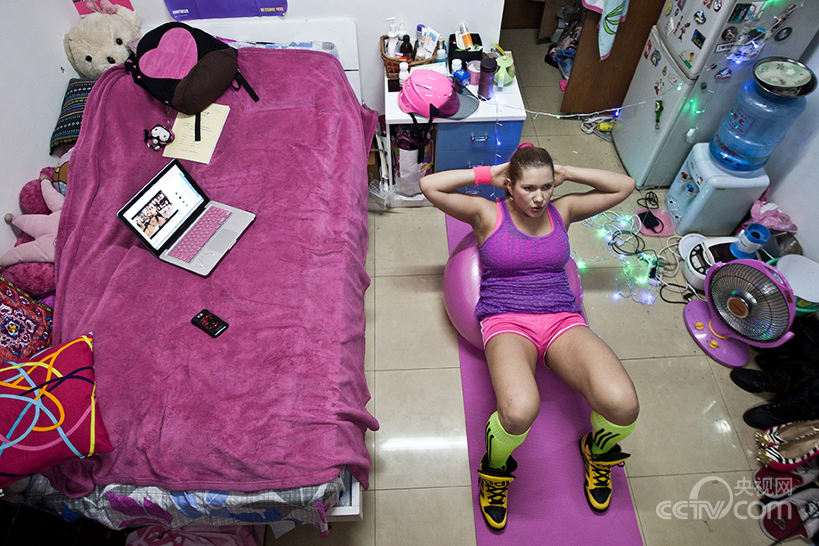 Ukrainian student Natasha works out in her apartment in Hangzhou on Dec. 28, 2012. (Photo/CNTV)