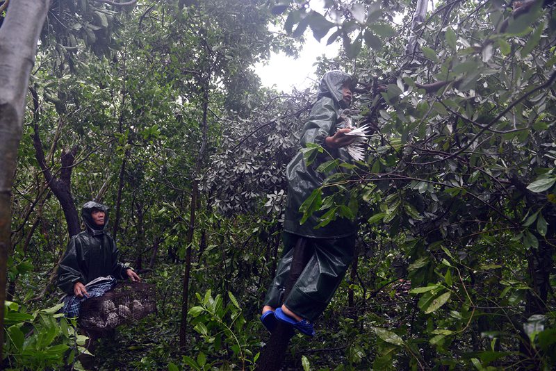 Villager Fu Feiwu and his 13-year-old son enter the forest, looking for wounded herons in the early morning after the rampage of the typhoon. (Photo/ Deng Bo)