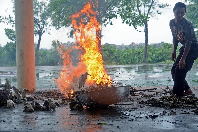After Fu Feiwu lights up firewood, some herons rush to it for warmth. An hour later, more herons could stand up. (Photo/ Deng Bo)