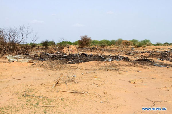 | Photo taken on July 25, 2014 shows the crash site of the Air Algerie Flight AH 5017, in Mali's Gossi region. The second black box of the aircraft has been found in the crash site, the United Nations Multidimensional Integrated Stabilization Mission said on Saturday. [Photo: Xinhua] |