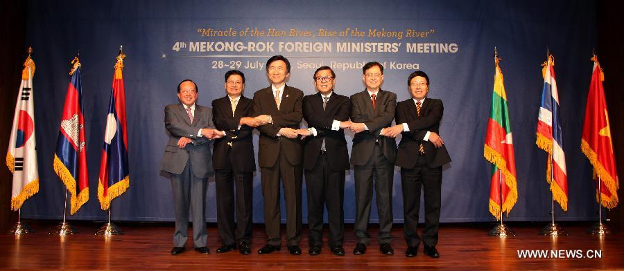 | (L-R) Cambodia's Foreign Minister Hor Namhong, Laos's Foreign Minister Thongloun Sisoulith, South Korea's Foreign Minister Yun Byung-Se, Thailand's Foreign Minister Sihasak Phuangketkeow, Myanmar's Deputy Foreign Minister U Thant Kyaw and Vietnam's Foreign Minister Pham Binh Minh attend the 4th Mekong-ROK Foreign Ministers' Meeting in Seoul, South Korea, on July 29, 2014. (Xinhua/Park Jin-hee) |