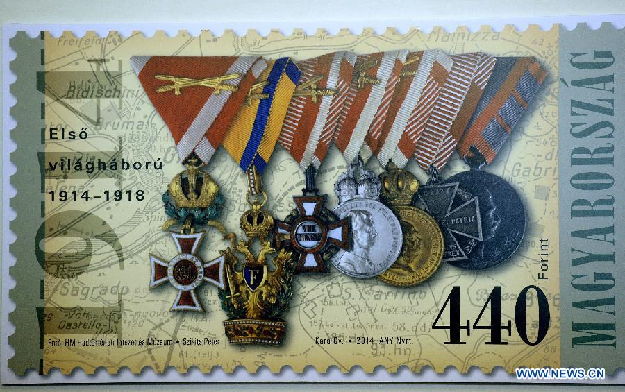 | A commemorative stamp is launched to mark the 100th anniversary of the First World War (WWI) in Budapest, Hungary, July 28, 2014. Hungary on Monday commemorated the beginning of the WWI that took more than ten million lives and left the world in tatters. (Xinhua/MTI/Kovacs Tamas) |