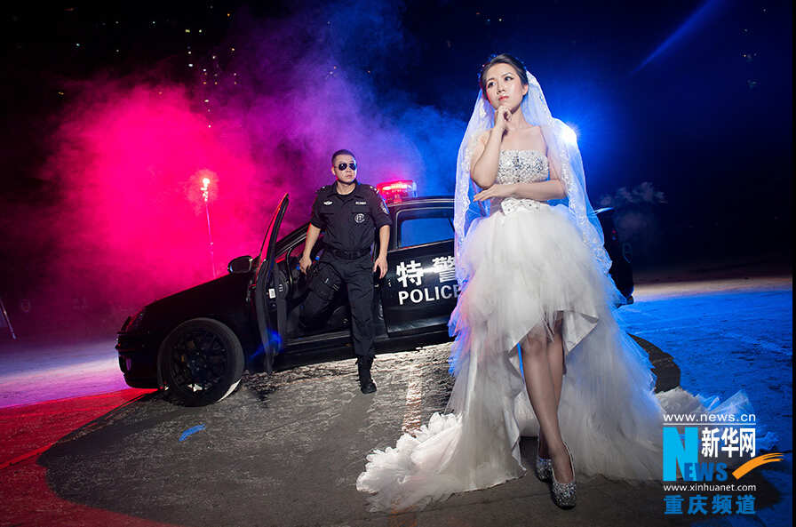 A member of the Chongqing Armed Police Corps snaps some rather incredible wedding photos with his bride-to-be at a Special Weapons and Tactics (SWAT) training center.
