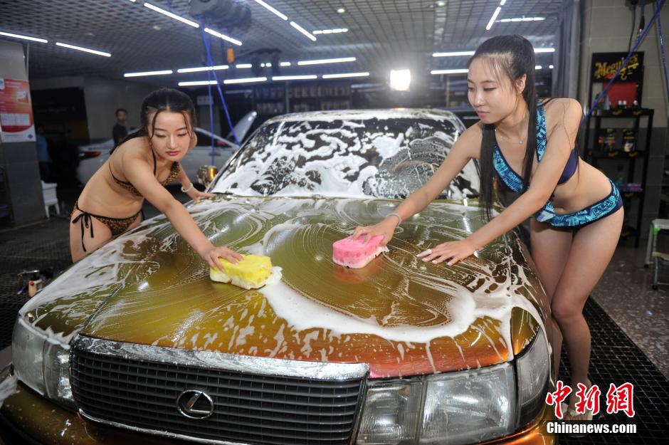 Two models in bikini wash the cars in a commercial activity in Taiyuan, north China's Shanxi province on July 27, 2014, which has attracted public's attention. (CNS/Wei Liang)