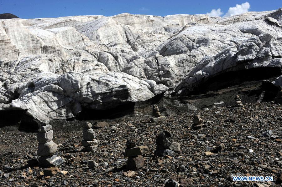 Photo taken on July 15, 2014 shows the melting ice of Purog Kangri Glacier in Shuanghu County, Nagqu, southwest China's Tibet Autonomous Region. As the highest terrain in the world's mid-latitude regions, China's Qinghai-Tibet Plateau is now under negative influence of the global warming. Purog Kangri Glacier, the third largest in the world, has shrunk by 50 meters over the past 30 years. (Xinhua/Tang Zhaoming)