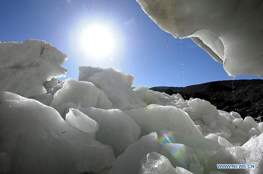 Photo taken on July 15, 2014 shows the melting ice of Purog Kangri Glacier in Shuanghu County, Nagqu, southwest China's Tibet Autonomous Region. As the highest terrain in the world's mid-latitude regions, China's Qinghai-Tibet Plateau is now under negative influence of the global warming. Purog Kangri Glacier, the third largest in the world, has shrunk by 50 meters over the past 30 years. (Xinhua/Tang Zhaoming)