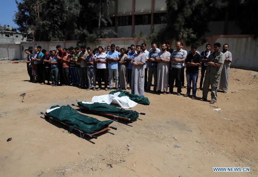 Palestinian mourners pray over the bodies of al-Silk family, whom medics said were killed in an Israeli airstrike at a market place in Al-Shejaiya neighborhood, during their funeral in Gaza City on July 31, 2014. Around 17 Israeli artillery shells struck on the market Wednesday , killing 17 Palestinians and wounded more than 170 people, medics and witnesses said. (Xinhua/Yasser Qudih)