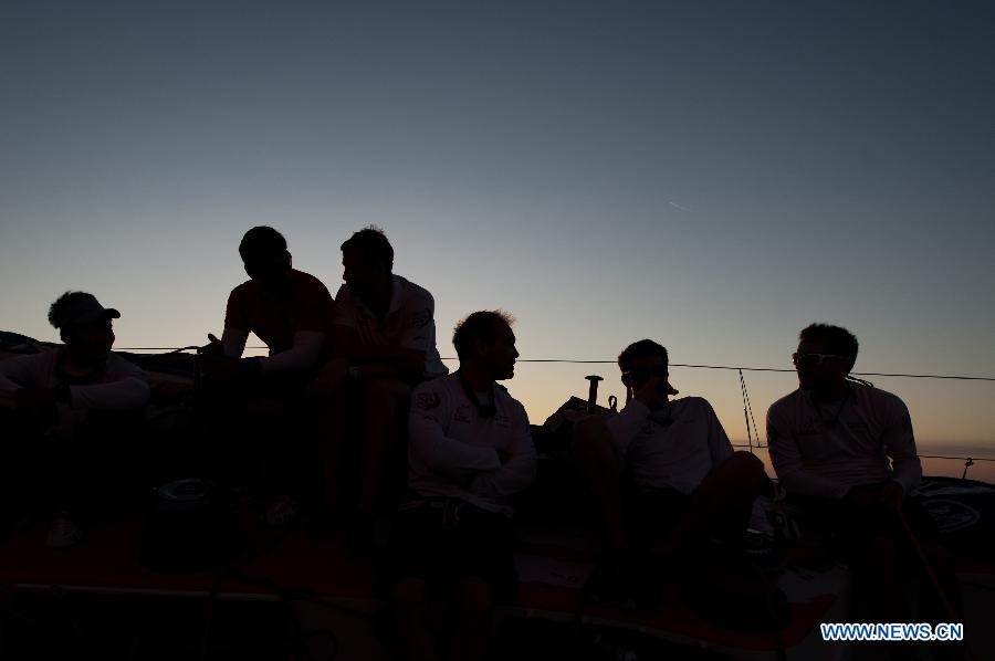 Crew members of Dongfeng Team chat in the twilight on the deck during the offshore training in the Bay of Biscay, western France, on July 3, 2014. The China's Dongfeng Team prepares for Volvo Ocean Race 2014-2015 starting from Alicante of Spain in October, and it will last for nearly 9 months with 10 legs of competition over almost 39000 nautical miles (72000 km) around the world until it ends in Gothenburg of Sweden in June 2015. (Xinhua/Bu Duomen)