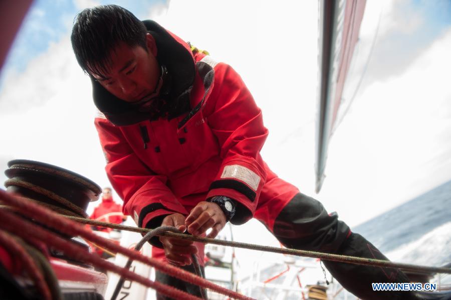 Yang Jiru, 23, pit of Dongfeng Team cleans the cord at the cockpit during the offshore training in the Bay of Biscay, western France, on July 4, 2014. The China's Dongfeng Team prepares for Volvo Ocean Race 2014-2015 starting from Alicante of Spain in October, and it will last for nearly 9 months with 10 legs of competition over almost 39000 nautical miles (72000 km) around the world until it ends in Gothenburg of Sweden in June 2015. (Xinhua/Bu Duomen)