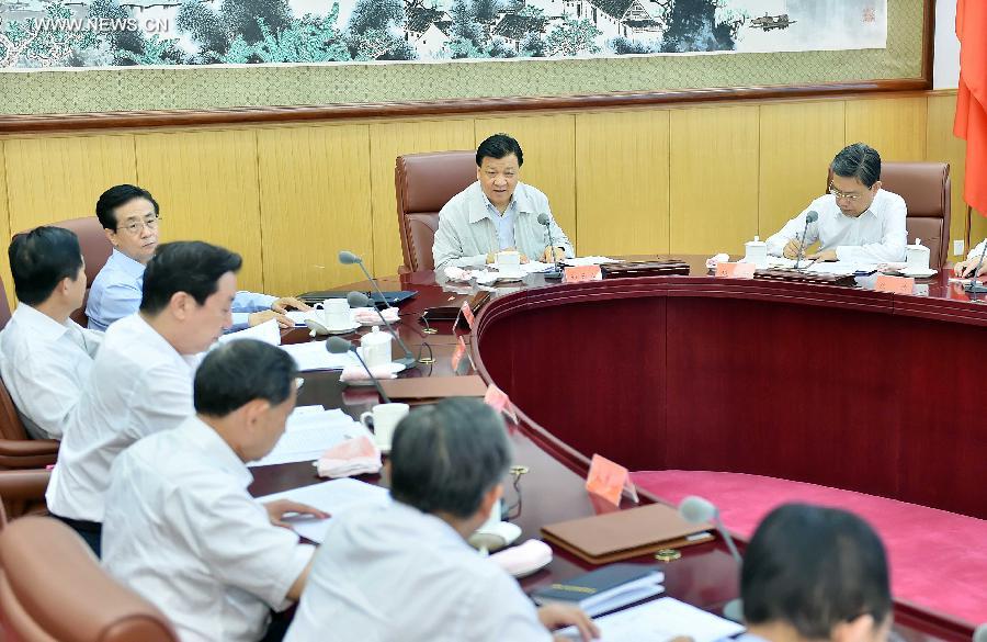 | Liu Yunshan (2nd R, back), a member of the Standing Committee of the Communist Party of China Central Committee's Political Bureau, presides over a meeting concerning the Party's "mass-line" campaign in Beijing, China, July 30, 2014. (Xinhua/Li Tao) |