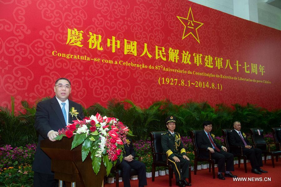 Chui Sai On (1st L), chief executive of China's Macao Special Administrative Region (SAR), addresses a reception held to celebrate the 87th anniversary of the founding of the Chinese People's Liberation Army (PLA) by the PLA Garrison in Macao, south China, July 31, 2014. (Xinhua/Cheong Kam Ka)