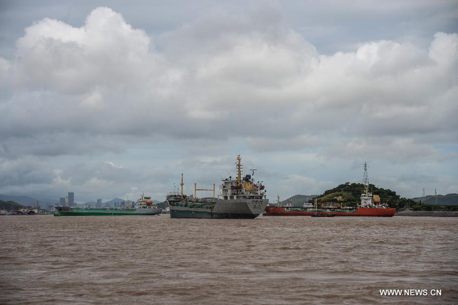 Cargo ships are berthed in a harbor in Zhoushan, east China's Zhejiang Province, July 31, 2014. Typhoon Nakri is moving from waters southwest of Taiwan Island into the East China Sea at a speed of 20 to 25 kilometers per hour (kph), said China's National Marine Environmental Forecasting Center on Thursday. Emergency response programs have been launched by local governmental department in Zhejiang. (Xinhua/Xu Yu)