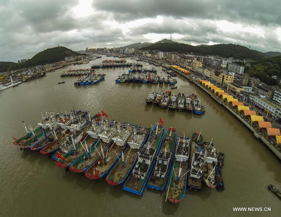 Fishing boats are berthed in a harbor in Zhoushan, east China's Zhejiang Province, July 31, 2014. Typhoon Nakri is moving from waters southwest of Taiwan Island into the East China Sea at a speed of 20 to 25 kilometers per hour (kph), said China's National Marine Environmental Forecasting Center on Thursday. Emergency response programs have been launched by local governmental department in Zhejiang. (Xinhua/Xu Yu)