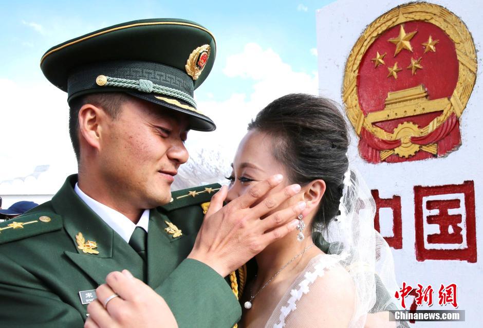 A collective wedding is held in front of the No. 7 pillar at the border between China and Pakistan in Taxkorgan, northwest China's Xinjiang on July 30, 2014. Fiver frontier soldiers and their brides swore their loves in front of the pillar on the plateau. (Photo/CNS)