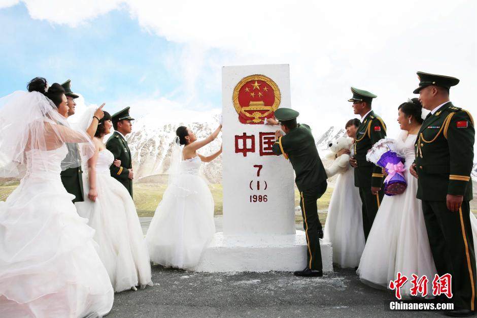 A collective wedding is held in front of the No. 7 pillar at the border between China and Pakistan in Taxkorgan, northwest China's Xinjiang on July 30, 2014. Fiver frontier soldiers and their brides swore their loves in front of the pillar on the plateau. (Photo/CNS)