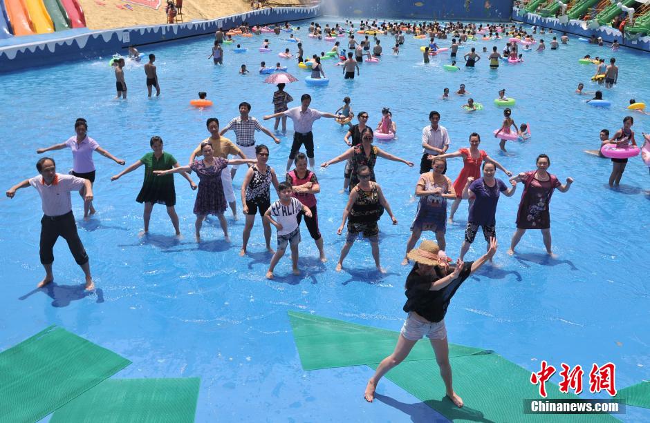 People dance to "Little Apple" in a swimming pool in SW China's Chongqing on July 30, 2014. By the Chopsticks Brothers, "Little Apple" is one of the most popular songs in China. (Photo/CNS)