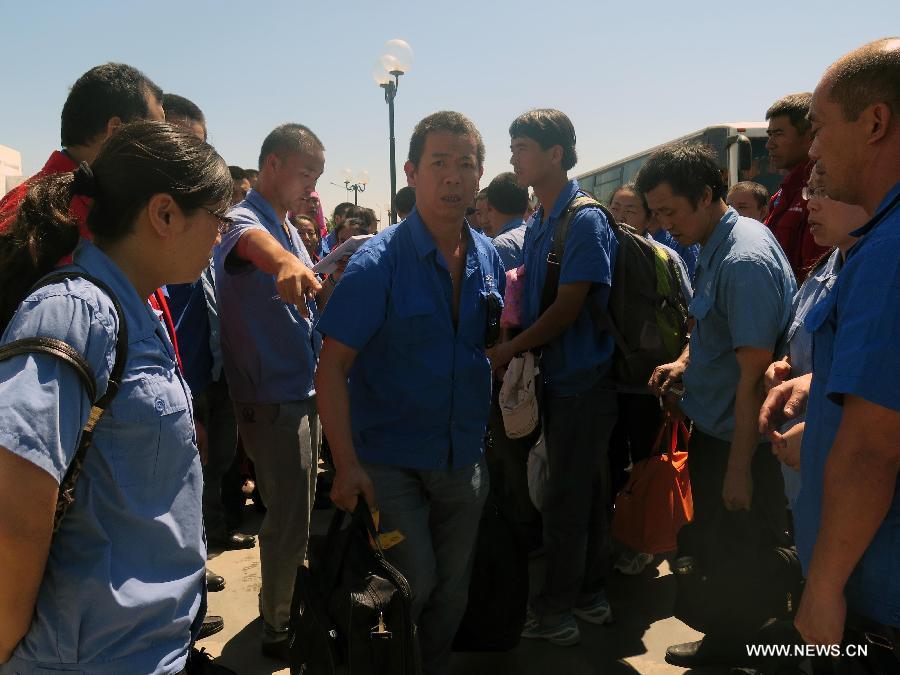 Chinese employees of a steel plant arrive at the Carthage Airport in Tunis, Tunisia, Aug. 1, 2014. 121 Chinese nationals, who had been evacuated from violence-hit Libya, reached Tunisia early Friday, the Chinese Embassy said. They traveled to the Tunisian capital, from where they would be flown home. (Xinhua/Pan Xiaojing)