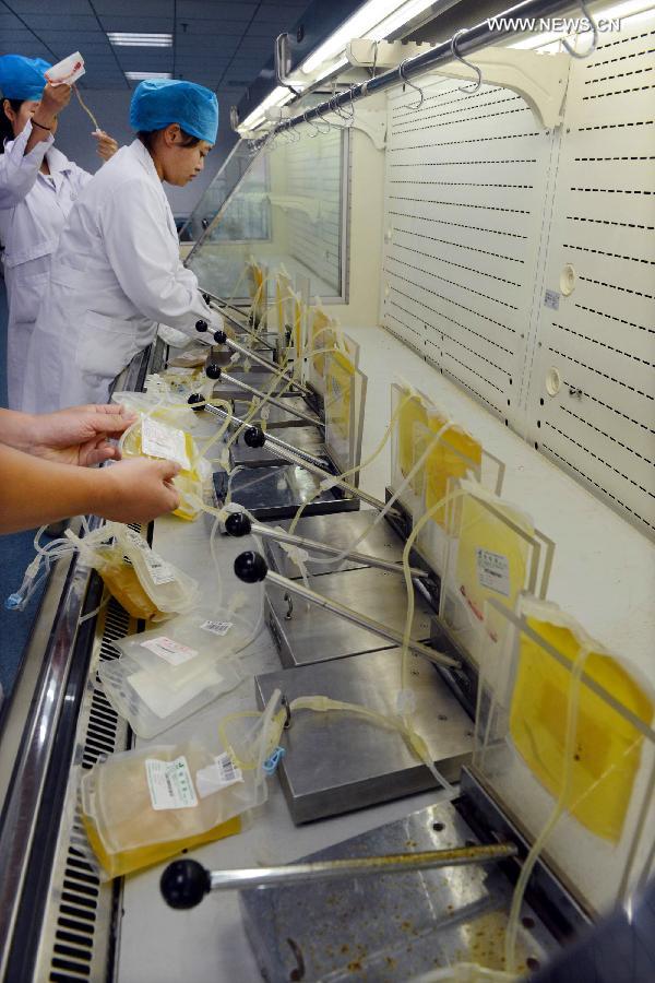 Staff members of local blood bank prepare blood plasma at Zhenjiang City, east China's Jiangsu province, Aug. 2, 2014. A powerful factory blast has killed 69 people and injured over 180 others in Kunshan City of Jiangsu on Saturday morning. The injured have been treated in hospitals in Kunshan and the nearby cities of Suzhou, Wuxi and Shanghai. Blood banks in Zhenjiang also prepare for the medical treatment of victims of the accident. (Xinhua/Wang Cheng)