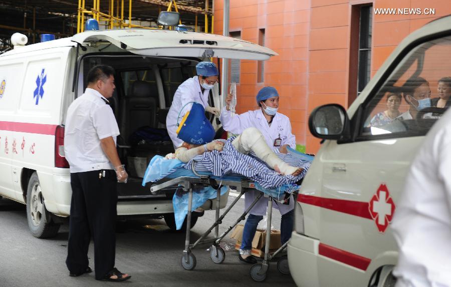 An injured person of a blast accident in Kunshan arrives at the Third People's Hospital of Wuxi City, east China's Jiangsu province, Aug. 2, 2014. A powerful factory blast has killed 69 people and injured over 180 others in Kunshan on Saturday morning. The injured have been treated in hospitals in Kunshan and the nearby cities of Suzhou, Wuxi and Shanghai. (Xinhua)