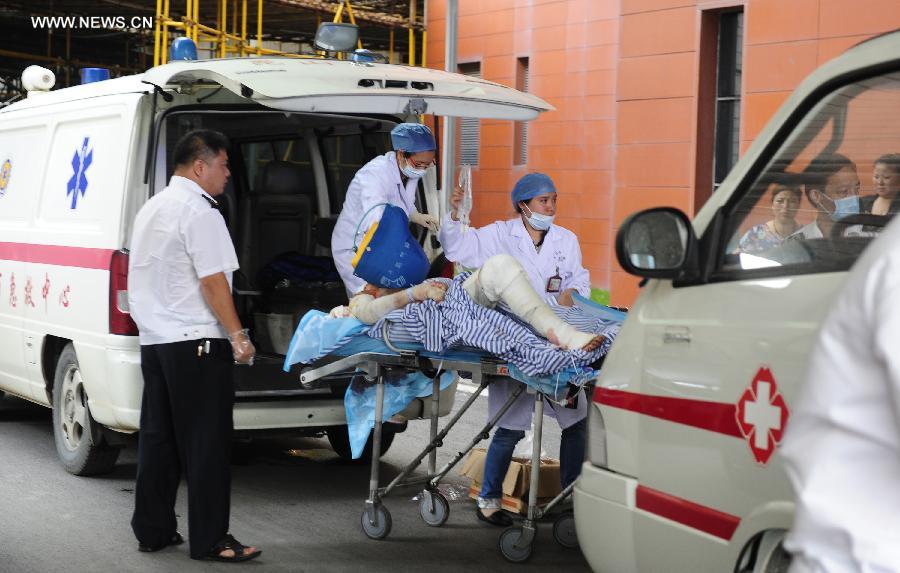 An injured person of a blast accident in Kunshan arrives at the Third People's Hospital of Wuxi City, east China's Jiangsu province, Aug. 2, 2014. A powerful factory blast has killed 69 people and injured over 180 others in Kunshan on Saturday morning. The injured have been treated in hospitals in Kunshan and the nearby cities of Suzhou, Wuxi and Shanghai. (Xinhua)