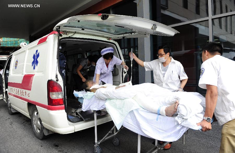An injured person of a blast accident in Kunshan arrives at the Third People's Hospital of Wuxi City, east China's Jiangsu province, Aug. 2, 2014. A powerful factory blast has killed 69 people and injured over 180 others in Kunshan on Saturday morning. The injured have been treated in hospitals in Kunshan and the nearby cities of Suzhou, Wuxi and Shanghai. (Xinhua)