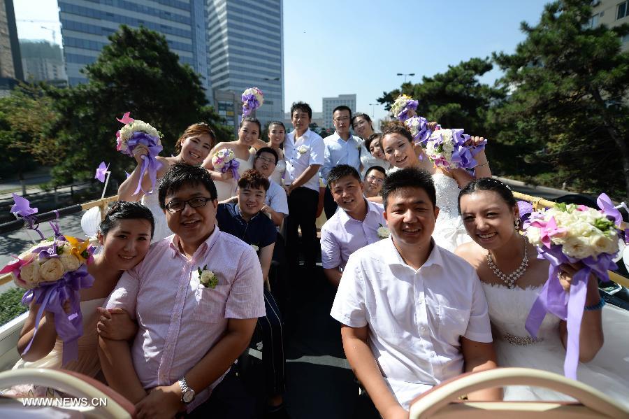 Couples throw up bundles of flowers during a group wedding ceremony in Shenyang, capital of northeast China's Liaoning Province, Aug. 2, 2014. The Qixi Festival, also known as Chinese Valentine's day, which falls on Aug. 2 this year, originates from a folk tale about a fairy falling in love with a mortal. The marriage allegedly enraged the Goddess of Heaven, who created the Milky Way to separate them. Supposedly, the pair of lovers are reunited for a single night each year by magpies that fly into the heavens and form a bridge for them to cross. (Xinhua/Pan Yulong)