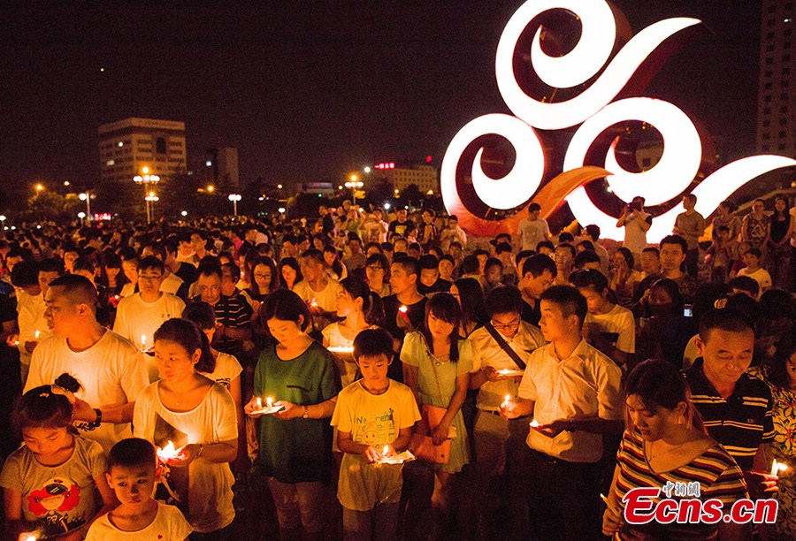 | People hold candles during a candlelight vigil to mourn the victims of Saturday's factory blast in Kunshan, east China's Jiangsu Province, August 2, 2014. The blast ripped through a wheel hub-polishing workshop owned by the Taiwanese-invested Kunshan Zhongrong Metal Products Co., Ltd in the city at 7:37 am on Saturday, killing at least 69 people and injuring more than 180 others. (Photo: China News Service/Li Ji) |