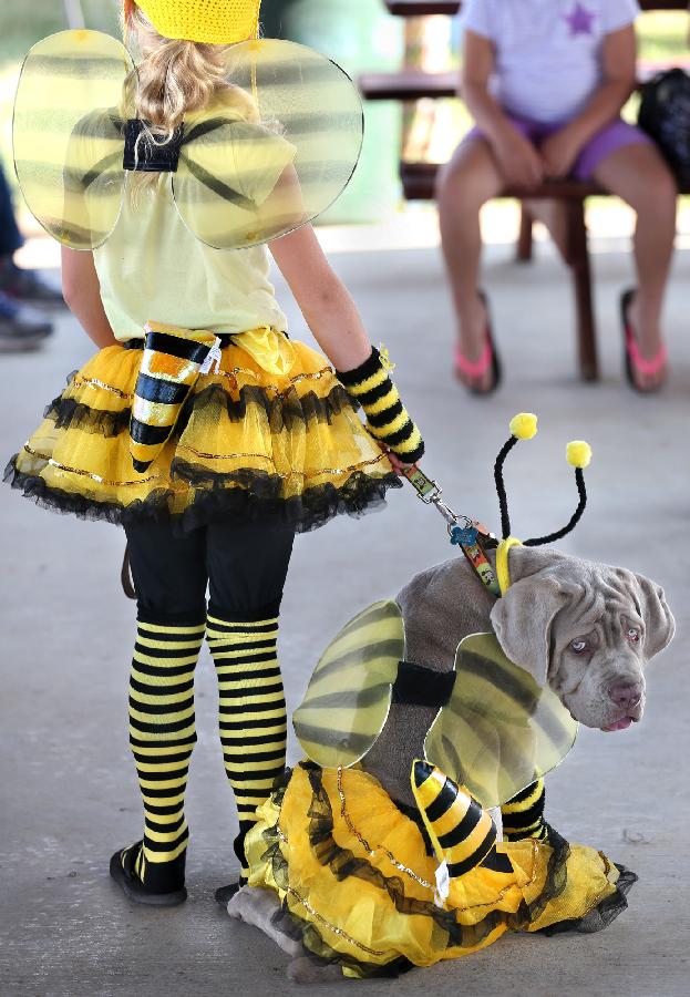 Homer, an 18-week-old mastiff, is dressed as a bumblebee along with his owner, Eddyn Molden, 8, of Middletown, Va. during the judging for the Best Costumed Pet at the Frederick County Fair in Clear Brook, Va. July 31, 2014. (Xinhua/AP Photo)