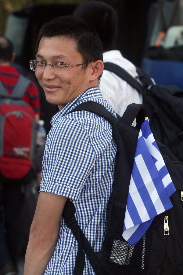 A Chinese evacuee from Libya arrives at Piraeus port, Greece, on Aug. 2, 2014. Greek frigate Salamis with Greeks and foreign nationals evacuated from violence-hit Libya on board reached Piraeus port on Saturday.(Xinhua/Marios Lolos)