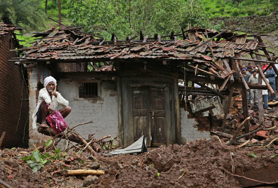 A villager watches a rescue operation sitting by his damaged house at the site of a landslide in Malin village, in the western Indian state of Maharashtra, Friday, Aug. 1, 2014. Heavy rains hampered efforts Friday by hundreds of rescue workers digging through heavy mud and debris, as the death toll from a landslide that engulfed an entire village in western India crossed 50.(Xinhua/AP Photo)