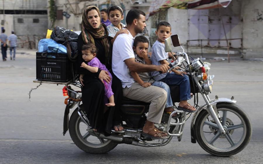 A Palestinian family ride a motorcycle as they flee their house in Khan Younis in the southern Gaza Strip August 1, 2014. (Xinhua/Reuters Photo)