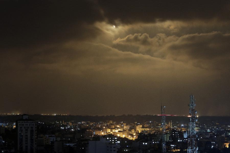In this slow exposure photo, flares light the sky over Gaza as a trace of Israeli shelling, bottom right, is seen from Gaza City, in the northern Gaza Strip, July 28, 2014. A truce between Israel and Hamas militants in Gaza remained elusive as diplomats sought to end the fighting at the start of the Eid al-Fitr holiday, marking the end of the Muslim holy month of Ramadan. (Xinhua/AP Photo)