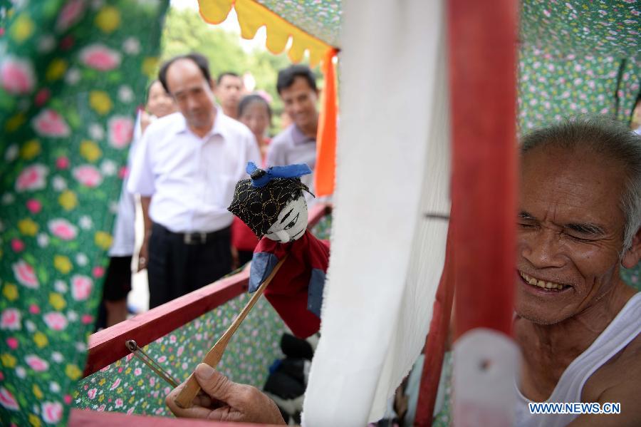| Local residents watch puppeteer Xiao Qiulin performing at a park in Yudu County, east China's Jiangxi Province, Aug. 1, 2014. Xiao, 65, started making a living by performing puppet shows for local residents since his twenties. With a stage enclosed by a piece of cloth, a set of instruments and several puppets, Xiao could perform a show for his audience all by himself. Now Xiao has recruited several apprentices, hoping that one day he could build a puppet troupe and his craftsmanship could be carried forward. (Xinhua/Chen Zixia) |