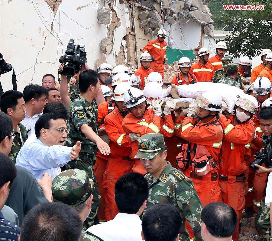 Chinese Premier Li Keqiang helps make way for the injured at the earthquake zone in southwest China's Yunnan Province, Aug. 4, 2014. Premier Li Keqiang walked into Longtoushan Township of Ludian County Monday to examine the situation of the earthquake and instruct the quake relief work. (Xinhua/Yao Dawei)