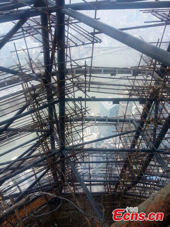 The final steel beam was installed on Shanghai's tallest building on Sunday, August 3, 2014, with the skyscraper reaching is designed height of 632 meters. The 137-story Shanghai Tower in Lujiazui financial and trade zone in the city's Pudong New Area is expected to open in the middle of next year. The landmark building will include offices, commercial space, a five-star hotel, exhibition and conference halls and recreational facilities. (China News Service/Pan Suofei)