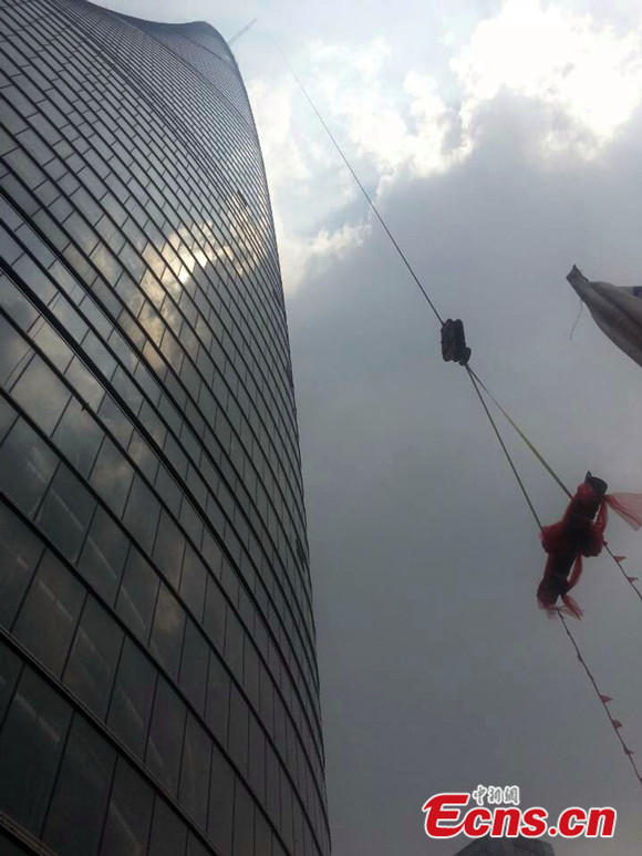 | The final steel beam was installed on Shanghai's tallest building on Sunday, August 3, 2014, with the skyscraper reaching is designed height of 632 meters. The 137-story Shanghai Tower in Lujiazui financial and trade zone in the city's Pudong New Area is expected to open in the middle of next year. The landmark building will include offices, commercial space, a five-star hotel, exhibition and conference halls and recreational facilities. (China News Service/Pan Suofei) |