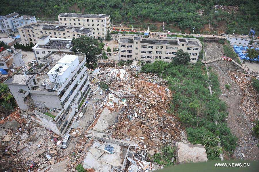 Aerial photo taken on Aug. 4, 2014 shows the quake-hit Longtoushan Town of Ludian County in Zhaotong City, southwest China's Yunnan Province. At least 381 people have been killed after a 6.5-magnitude earthquake rattled the province Sunday afternoon. The epicenter of the strong quake is in Longtoushan Town. (Xinhua/Xue Yubin)