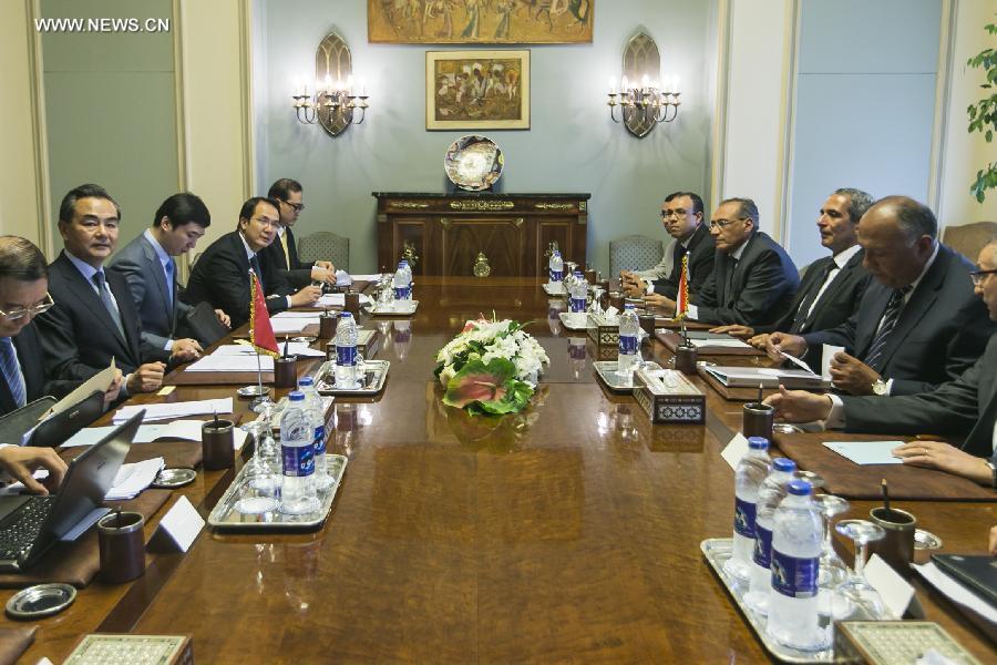 | China's Foreign Minister Wang Yi (2nd L) holds a meeting with his Egyptian counterpart Sameh Shoukry (2nd R) in Cairo, Egypt, Aug. 3, 2014. (Xinhua/Cui Xinyu) |