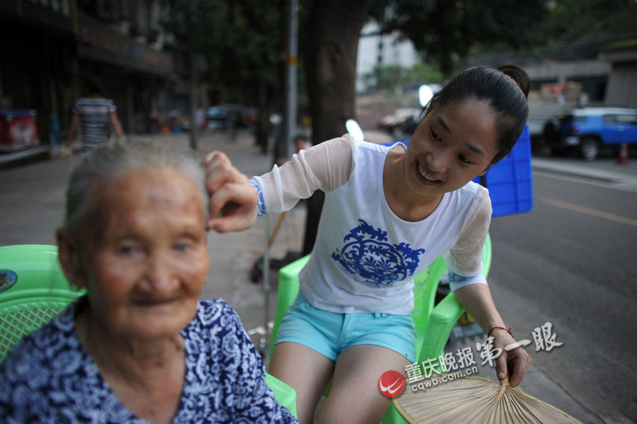 Huang Lihua, a post-90s girl, goes to work with her 88-year-old grandma, July 17, 2014. (Photo/cqwb.com.cn)