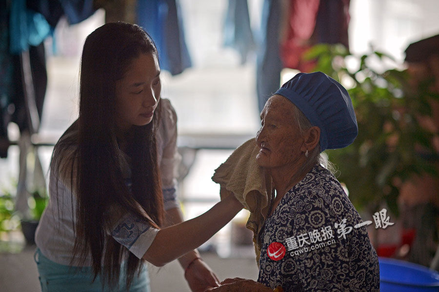 Huang cleans face for her grandma. (Photo/cqwb.com.cn)