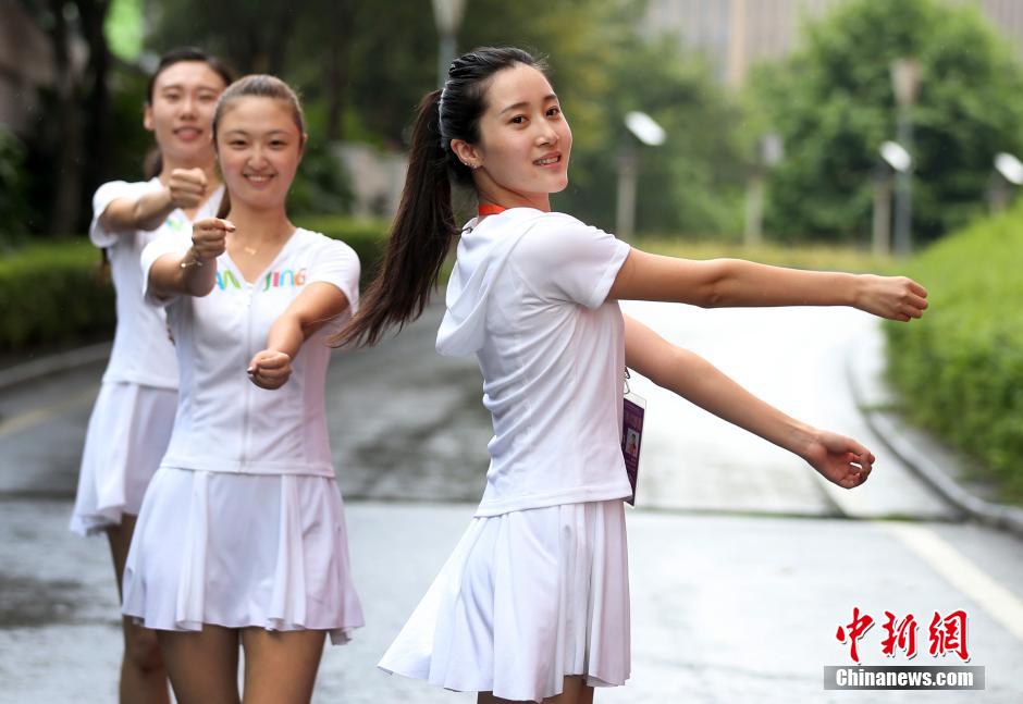 Braving the scorching heat, 205 guides selected from local universities and high schools devote themselves to the training for the opening and closing ceremonies of the 2nd Youth Olympic Games at the Olympic Sports Centre in Nanjing on August 1, 2014. (CNS/Yang Bo)