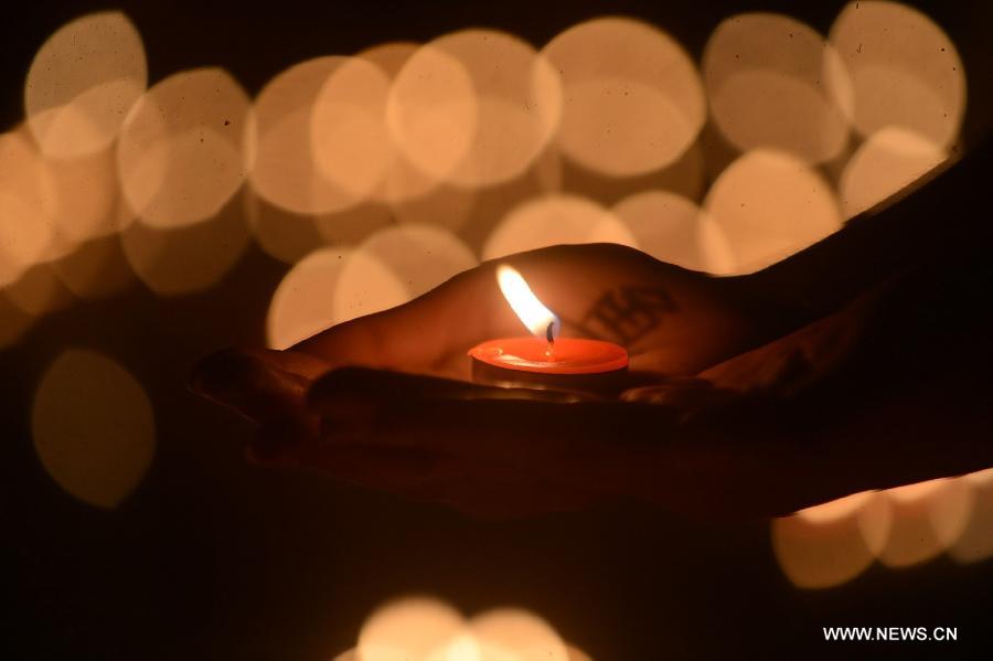 Residents light candles, praying for Ludian earthquake stricken area, in Guangling District in Yangzhou, east China's Jiangsu Province, Aug. 4, 2014. (Xinhua/Meng Delong)