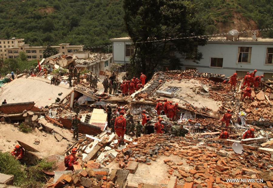 Officers and soldiers conduct rescue operation in Longtoushan township of Ludian county, southwest China's Yunnan Province, Aug. 4, 2014. At least 398 people have been killed after a 6.5-magnitude earthquake rattled the province Sunday afternoon. (Xinhua/Zhang Rong)