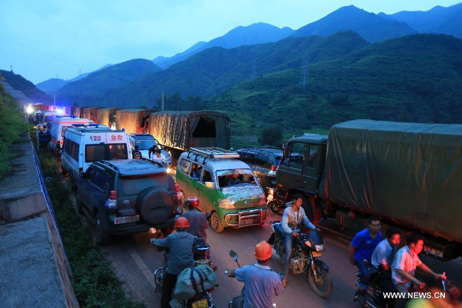Vehicles and pedestrians move out of the quake-stricken area in Longtoushan township of Ludian county, southwest China's Yunnan Province, Aug. 4, 2014. At least 398 people have been killed after a 6.5-magnitude earthquake rattled the province Sunday afternoon. (Xinhua/Xing Guangli)