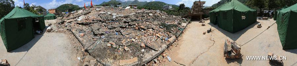 Panoramic photo taken on Aug. 5, 2014 shows quake-hit Longtoushan Town of Ludian County, southwest China's Yunnan Province, Aug. 5, 2014. At least 398 people have been killed after a 6.5-magnitude earthquake rattled the province Sunday afternoon. The epicenter of the strong quake is in Longtoushan Town. (Xinhua/Xing Guangli)